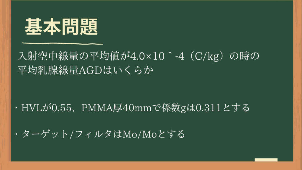 ここまででなんとなくお察しいただけるかと思いますが、算出したいのは平均的な乳房に対する値なので、係数gをかけることにより変換するというわけです。係数gを算出するには乳房厚と半価層が必要です。実はここが試験の計算問題で重要ポイントになってくる部分です‼︎(計算問題に関しては後ほど‥)単位はmGy/mGyとなっているため、入射空気カーマのmGyと掛け合わせるとmGyがAGDの単位として残ります。